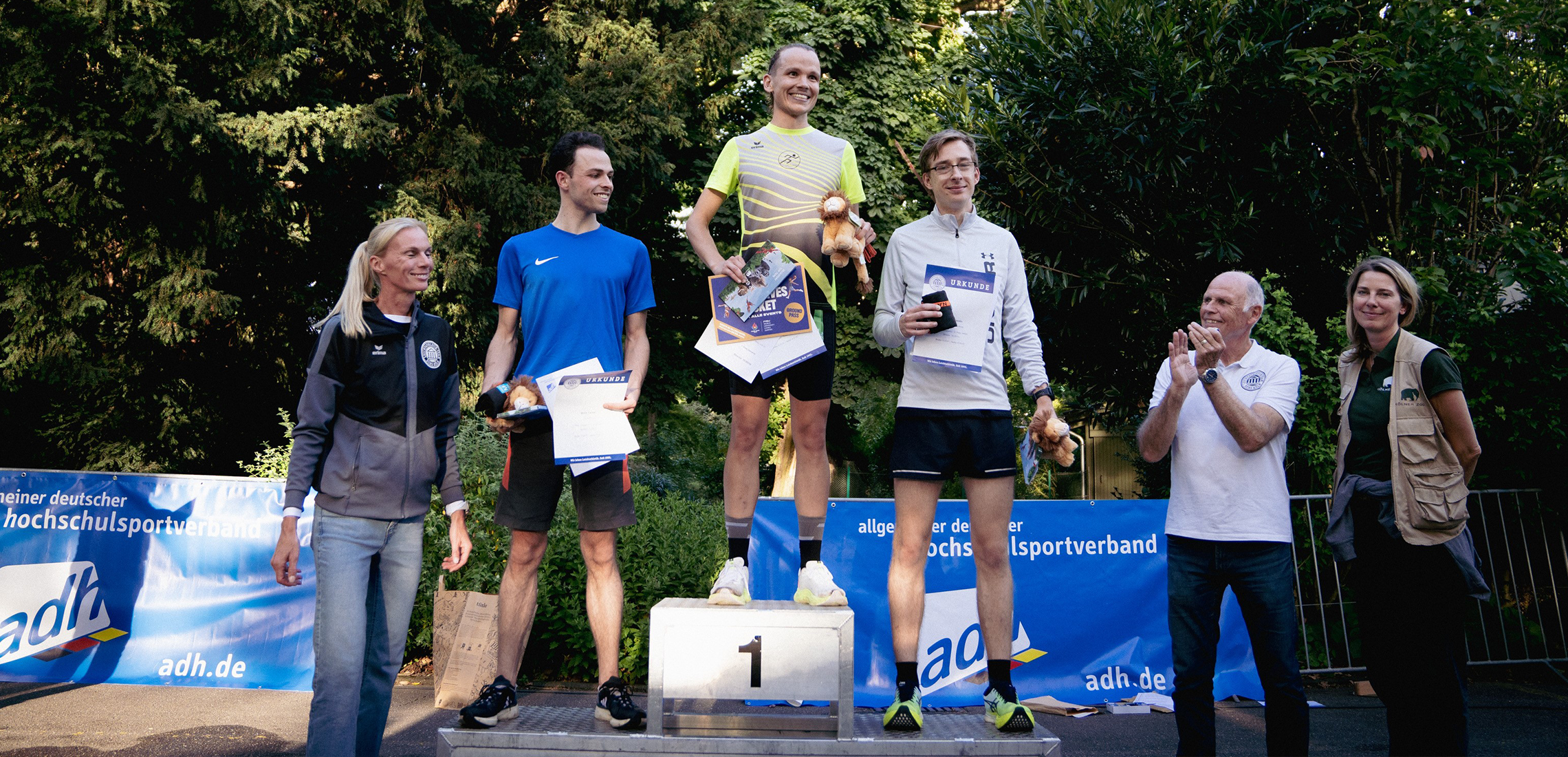In der Herrenkonkurrenz war von Beginn an klar, dass Fredrik Schäfer (Uni Freiburg) seine Chance auf den Sieg nutzen möchte. Mit einer bärenstarken ersten Runde (insgesamt müssen die Teilnehmenden 6 Runden durch den Zoo laufen) legte er den Grundstein zu einer sehr starken Gesamtzeit von 31:51 (Brutto) und einem doch recht deutlichen Vorsprung. Dahinter lieferten sich Malik Farhat (TU Berlin) und David Valentin (HSU UNIBW Hamburg) einen interessanten Kampf um die silberne adh Nadel, bei dem sich Malik (32:16 Brutto/32:15 Netto) von seinem Kontrahenten David (33:01 Brutto/33:00 Netto) absetzen konnte und diesen Vorsprung dann auf der letzten Runde erfolgreich verteidigte.
