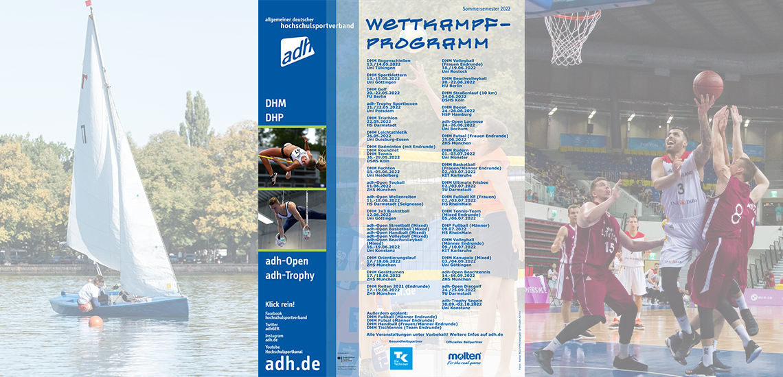Obwohl viele Hochschuleinrichtungen noch mit den Nachwirkungen der Corona-Pandemie zu kämpfen haben, ist die Bereitschaft zur Ausrichtung von nationalen Hochschulmeisterschaften für das kommende Sommersemester überwältigend. Ganze 19 Deutsche Hochschulmeisterschaften (DHM) sind derzeit von Mai bis September geplant. Zwölf adh-Open sowie eine adh-Trophy und ein Deutscher Hochschulpokal (DHP) komplettieren das Wettkampfprogramm.