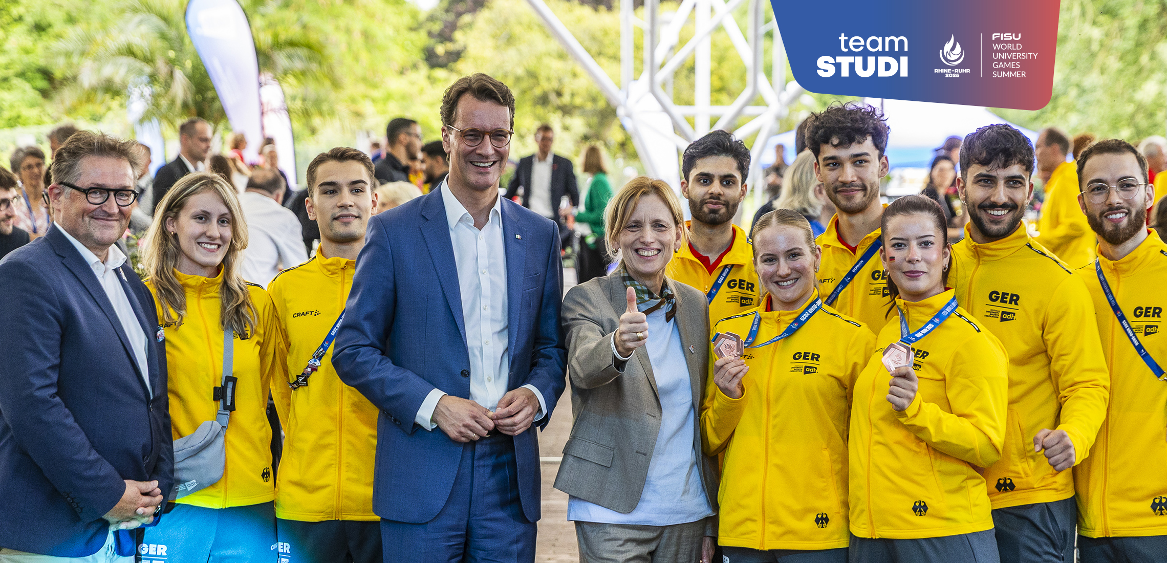 Die Rhine-Ruhr 2025 FISU Games markieren ein sportliches Großereignis mit internationaler Strahlkraft: Über 9.000 Athletinnen, Athleten und Offizielle sind zu Gast in Nordrhein-Westfalen und Berlin. Team Studi, die Deutsche Studierenden-Nationalmannschaft, ist mit 305 Aktiven das größte und mit durchschnittlich 21,9 Jahren das jüngste deutsche Team in der Geschichte der Games. Mit bisher sechs Gold-, vier Silber- und sieben Bronzemedaillen sowie zahlreichen persönlichen Bestleistungen konnte die deutsche Mannschaft ihre Leistungsfähigkeit bereits klar unter Beweis stellen. Für Deutschland ist die Ausrichtung der Spiele jedoch nicht nur sportlich bedeutsam – sie sind auch ein Aushängeschild für Werte wie Weltoffenheit, Bildung, Inklusion, Fairness und Nachhaltigkeit.