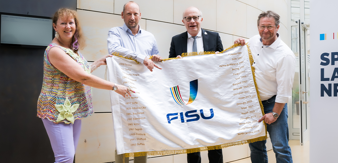 Am 15. August 2023 haben am Rande der Sportausschusssitzung Andrea Milz, Staatssekretärin für Sport und Ehrenamt, und Bernhard Hoppe-Biermeyer (CDU), Vorsitzender des Sportausschusses, die FISU-Flagge von Niklas Börger, CEO des Organisationskomitees, und Jörg Förster, Vorstandsvorsitzender des Allgemeinen Deutschen Hochschulsportverbands (adh), entgegengenommen - ein symbolischer Startschuss für die FISU Games 2025 an Rhein und Ruhr.