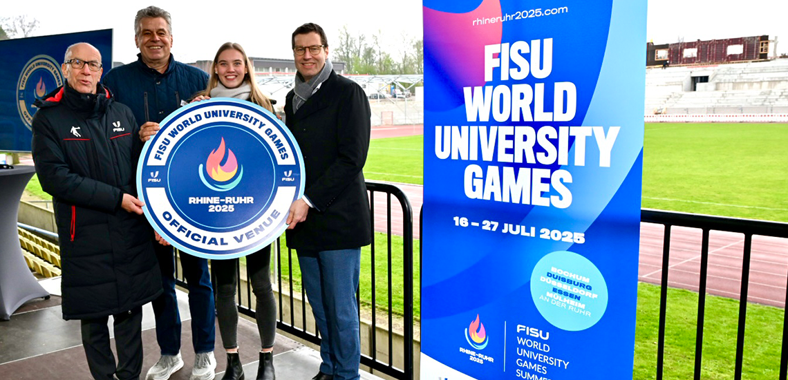 Wie der Sportpark Lohrheide im Frühjahr 2025 exakt aussehen wird, stellte Carolin Jakobi von der assmann GmbH beim Presse-Event in einer Präsentation vor. Ein aufgezeichneter Drohnenflug zeigte den Status quo. Am Ende der Veranstaltung dann der Höhepunkt: FISU-Präsident Leonz Eder überreichte Bochums Oberbürgermeister Thomas Eiskirch die erste offizielle Plakette mit der Aufschrift: “Official Venue FISU World University Games”. Insgesamt wird es bei den Spielen im nächsten Jahr 22 Austragungsorte in den Städten Bochum, Duisburg, Düsseldorf, Essen und Mülheim an der Ruhr geben. Die Leichtathletik-Wettbewerbe in Bochum-Wattenscheid nehmen dabei ähnlich wie bei den Olympischen Spielen eine besondere Rolle ein. Das machte auch FISU-Präsident Leonz Eder deutlich: „Die Athletinnen und Athleten werden sich im ‚Sportpark Lohrheide‘ wohlfühlen. Wir sind sehr stolz, hier dann im nächsten Jahr mit den Leichtathletik-Wettbewerben ein absolutes Highlight bei den Rhine-Ruhr 2025 FISU World University Games austragen zu dürfen.“