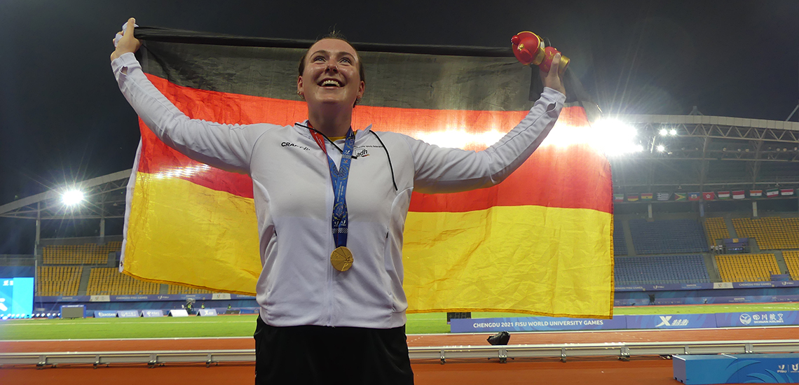 Einen starken Auftritt zeigte Antonia Kinzel (HS Mannheim) im Diskuswurf. Direkt im zweiten Versuch gelang ihr der Wurf über 59.18 Meter. Damit erfüllt sie sich mit mehr als zwei Metern Vorsprung vor der Konkurrenz den Wunsch nach der Goldmedaille bei den FISU World University Games. „Ich bin richtig glücklich über die heutige Medaille. Ich hatte mit Edelmetall geliebäugelt, aber dass es bei der starken Konkurrenz Gold wird, hätte ich nicht gedacht. Ich freue mich auch schon riesig drauf, in zwei Jahren bei den Rhine-Ruhr FISU World University Games vor heimischem Publikum an den Start zu gehen“, blickte Kinzel nach vorn.