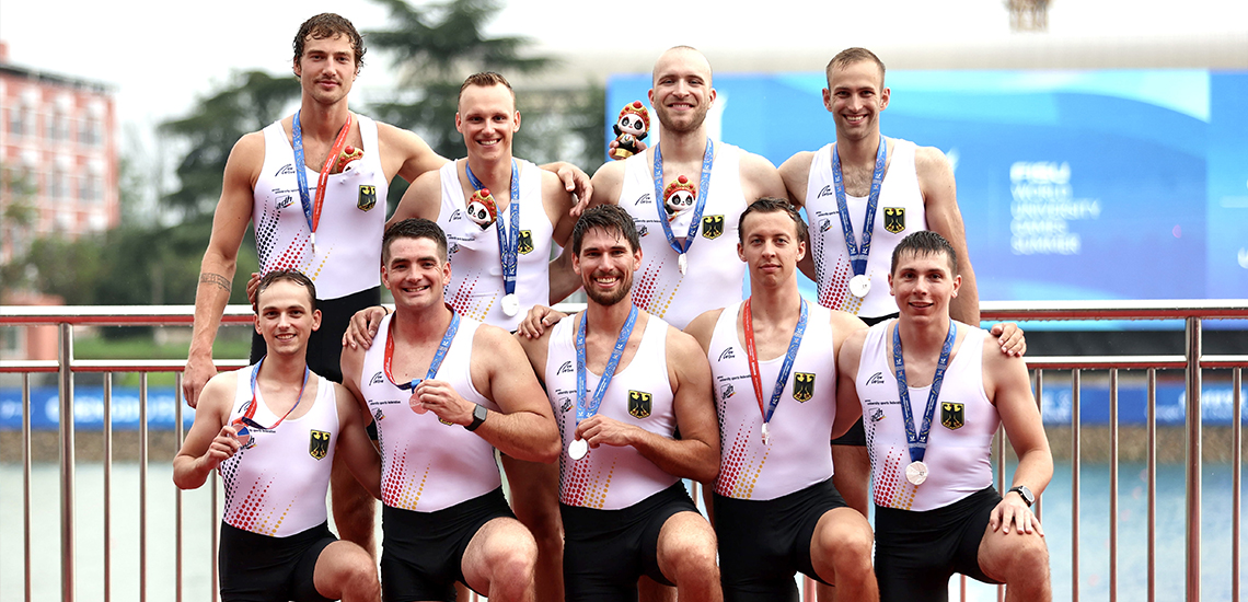 Im Männerachter holten Friedrich Dunkel (Uni Hamburg), Lukas Föbinger (TU Dortmund), Henry Hopmann (Uni Bochum), David Keefer (TU Dortmund), Henning Köncke (Medical School Hamburg), Till Martini (Uni Erlangen-Nürnberg), Leon Schandl (TU Dortmund), Rene Schmela (HS Ruhr-West) und Tom Tewes (Uni Bochum) die Silbermedaille vor China. Der Achter fuhr einen guten Start und schob sich über Zwischensprints immer weiter nach vorne. Schlag um Schlag konnte sich das deutsche Team den Silberrang sichern und musste sich lediglich den starken Niederländern geschlagen geben. „Wir haben das Rennen in einem technisch hochkarätigen Feld gut gelöst“, freute sich Hopmann.