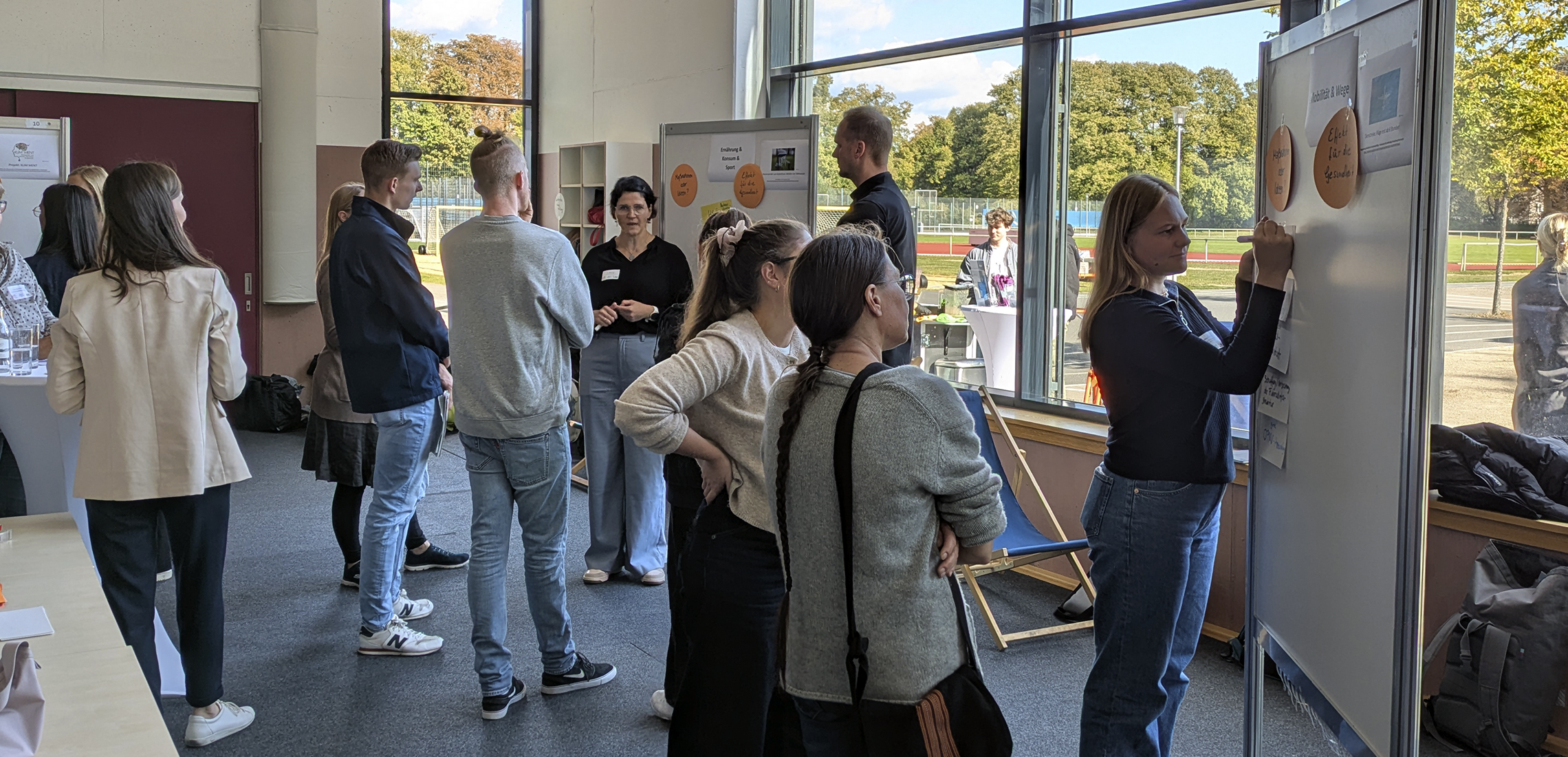 Nach der Mittagspause startete die zweite Phase mit jeweils drei Workshops. Im zweiten Workshop des adh zusammen mit Mitarbeitenden des Modellprojekts Gesundheits- und Nachhaltigkeitskompetenzen von Studierenden (MoNaKo) mit dem Titel „Gesundheits- und Nachhaltigkeitskompetenzen im Studienalltag“ reflektierten die Teilnehmenden zunächst ihre eigenen Gesundheitskompetenzen. In der darauffolgenden Kleingruppenarbeit wurden Ideen zur nachhaltigen Kompetenzstärkung gesammelt und anschließend konkrete Lern- und Praxisräume entwickelt. Ziel war es, Bedingungen zu identifizieren, die den Transfer von Gesundheitskompetenzen in den Studienalltag gelingen lassen. Die gleichzeitig laufenden Workshops hatten eine nachhaltige Campusgestaltung sowie die Ernährungswende auf dem Campus zum Schwerpunkt.