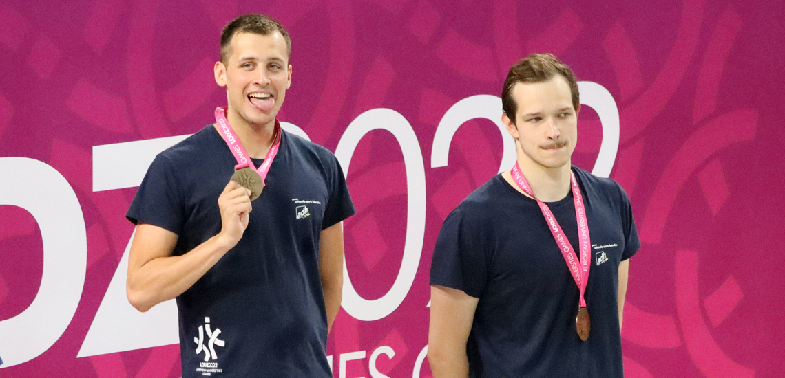 (29.07.2022) Bei den European Universities Games (EUG) 2022 präsentieren sich die Sportlerinnen und Sportler der deutschen Hochschulen nach wie vor in Höchstform. Vier Medaillen gab es im Schwimmen zu bejubeln, darunter eine goldene. Bronze holten die Aktiven im Badminton (2x), Taekwondo und Klettern.