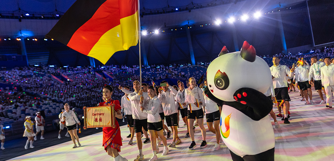 Unter dem Motto „Chengdu makes dreams come true“ wurden heute die FISU World University Games in Chengdu feierlich eröffnet. Vom 28. Juli bis 8. August finden die Weltspiele der Studierenden in der westchinesischen Metropole statt. 160 Sportlerinnen und Sportler vertreten in den kommenden Tagen die deutschen Farben, angeführt von der Turnerin Aiyu Zhu (Uni zu Köln) und dem Schwimmer Henning Mühlleitner (HS Heilbronn).