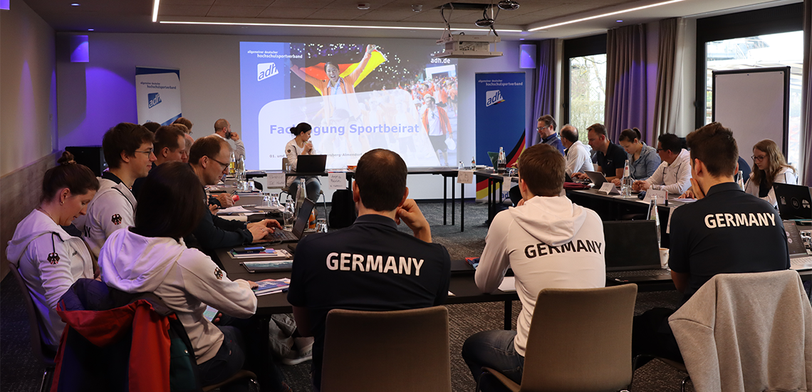 Außerdem stellte sich adh-Event-Inklusionsmanager Louis Kleemeyer dem Sportbeirat vor und beschrieb den Prozess zur Förderung der inklusiven Teilnahme von Para- und Special-Sportlerinnen und Sportlern bei Deutschen Hochschulmeisterschaften (DHM). Voraussichtlich soll schon in diesem Sommer die erste DHM mit inklusiven Angeboten durchgeführt werden.