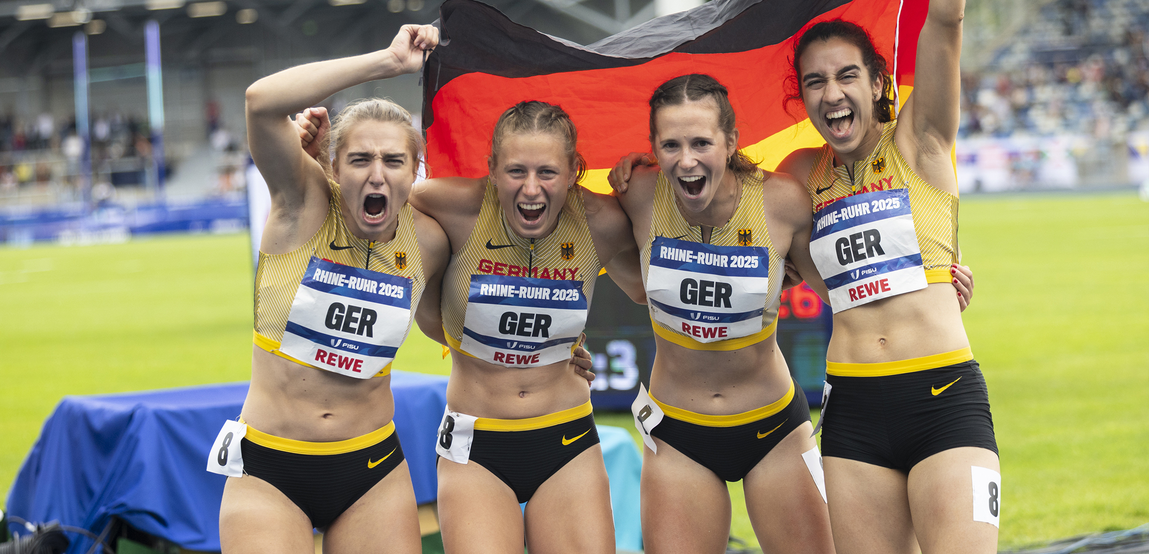 Am letzten Tag der Leichtathletikwettbewerbe gelang Team Studi über die 4x400 Meter Staffel der Frauen der Gold-Coup: Yasmin Amaadacho (Uni Zürich), Vivienne Morgenstern (TU Dresden), Mona Mayer (LMU München) und Sabrina Heil (Uni Frankfurt) sprinteten sensationell zum Sieg. „Unsere Staffel war eine kleine Achterbahnfahrt, nachdem es kurz auf der Kippe stand, ob wir überhaupt laufen können“, blickt Jenna Fee Feyerabend auf die letzten Tage zurück. Die Siebenkämpferin war kurzfristig im Halbfinale eingesprungen und hatte Team Studi damit überhaupt erst den Einzug ins Finale ermöglicht. „Wir sind super happy über die Goldmedaille“, resümierte Julia Morgenstern. „Wir hatten uns Edelmetall vorgenommen, aber dass es Gold wurde, darauf sind wir superstolz.“ Die Atmosphäre vor Heimpublikum wird das Quartett nach ihrem Sieg so schnell nicht vergessen. „Vor deutschem Publikum laufen zu dürfen, hat uns unglaublich getragen“, erzählte Mona Mayer. „Wir haben es sehr genossen, das war ein einmaliges Erlebnis.“