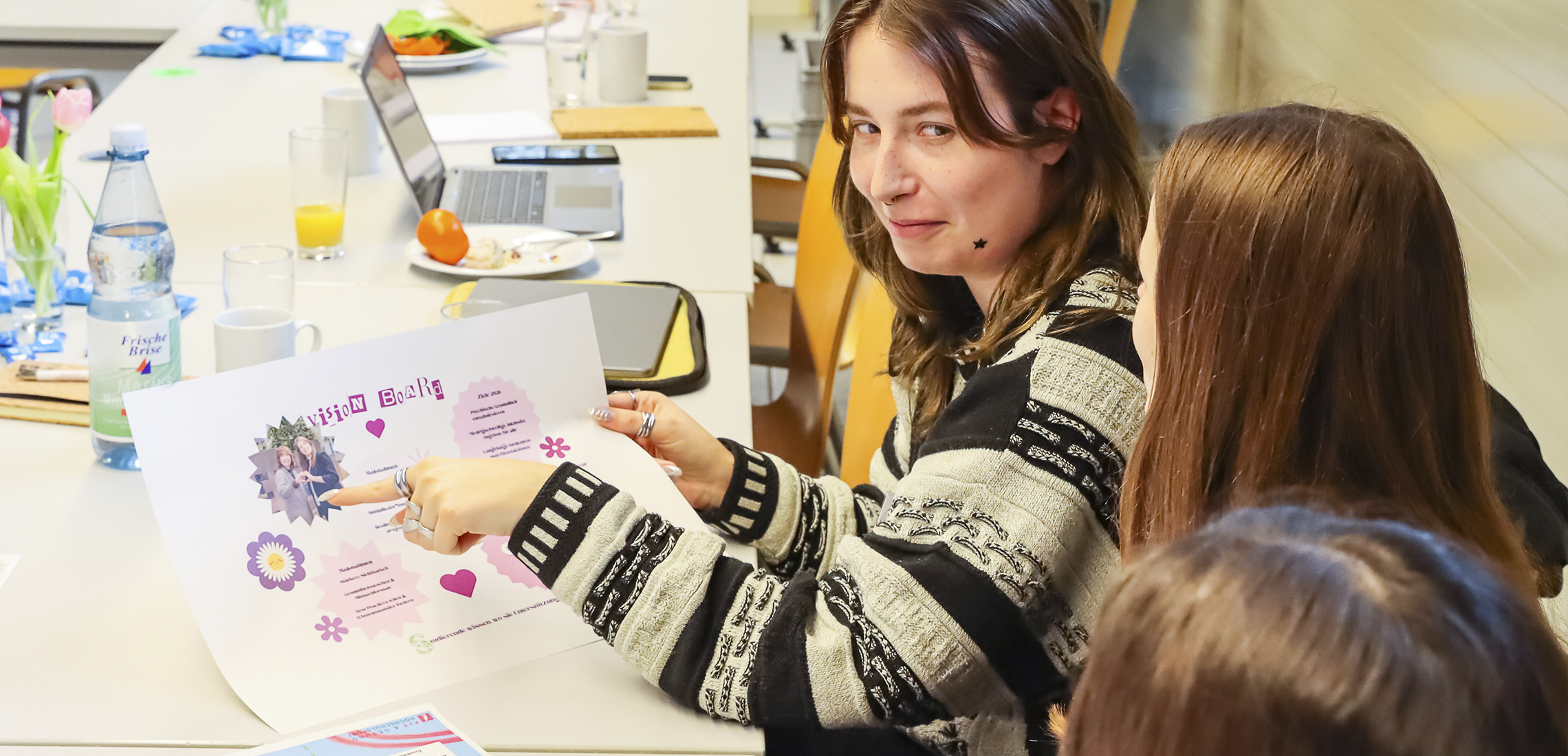 Im weiteren Verlauf stellten die Teilnehmenden ihre Visionboards vor, die sie in Zusammenarbeit mit ihren Patinnen und Paten im Voraus erarbeitet hatten. Darauf visualisierten sie ihre Ziele und Visionen für gesundes Arbeiten und Studieren im Jahr 2026 an ihrem jeweiligen Standort. Die Präsentation in Kleingruppen ermöglichte einen intensiven und gewinnbringenden Erfahrungsaustausch.