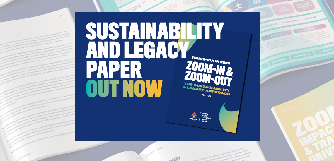Unter dem Titel „Zoom-In & Zoom-Out – The Sustainability & Legacy Approach“ beschreibt die Publikation den aktuellen Stand des Nachhaltigkeitsmanagements des Organisationskomitees. Dabei werden viele Fragen geklärt: Welche Maßnahmen werden bei den Rhine-Ruhr 2025 FISU World University Games verfolgt, um möglichst nachhaltige Spiele stattfinden zu lassen? Wie wird ein Beitrag zu den Sustainable Development Goals der Vereinten Nationen geleistet? Wie können positive gesellschaftliche Impulse hinterlassen und die Werte des Sports wie Respekt, Fairplay, Zusammenhalt oder Engagement transportiert und gestärkt werden?