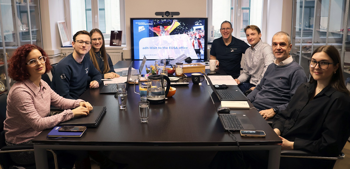 adh-Sportdirektor Thorsten Hütsch bilanziert das Arbeitstreffen wie folgt: “Der direkte persönliche Austausch zwischen den handelnden Personen bei EUSA und adh hat einen sehr hohen Wert und bietet beiden Seiten die Möglichkeit, die Perspektive des anderen besser zu verstehen. Ich hoffe, dass dies zu einer Optimierung der Abläufe in der adh-Geschäftsstelle führt und die wachsenden Aufgaben weiterhin mit hoher Qualität erfüllt werden können. Davon profitieren am Ende vor allem die adh-Mitgliedshochschulen und die studentischen Athletinnen und Athleten, für die die EUSA-Wettkampfveranstaltungen eine große Anziehungskraft haben.”